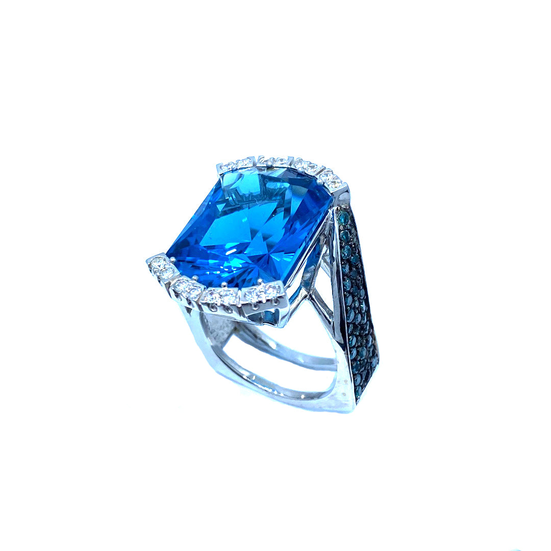 14 ct. white gold, with 20 ct. London Blue Topaz and .50 ct. white diamonds, 1.5ct. blue diamonds on the sides with black rodium layer ring. Any size.