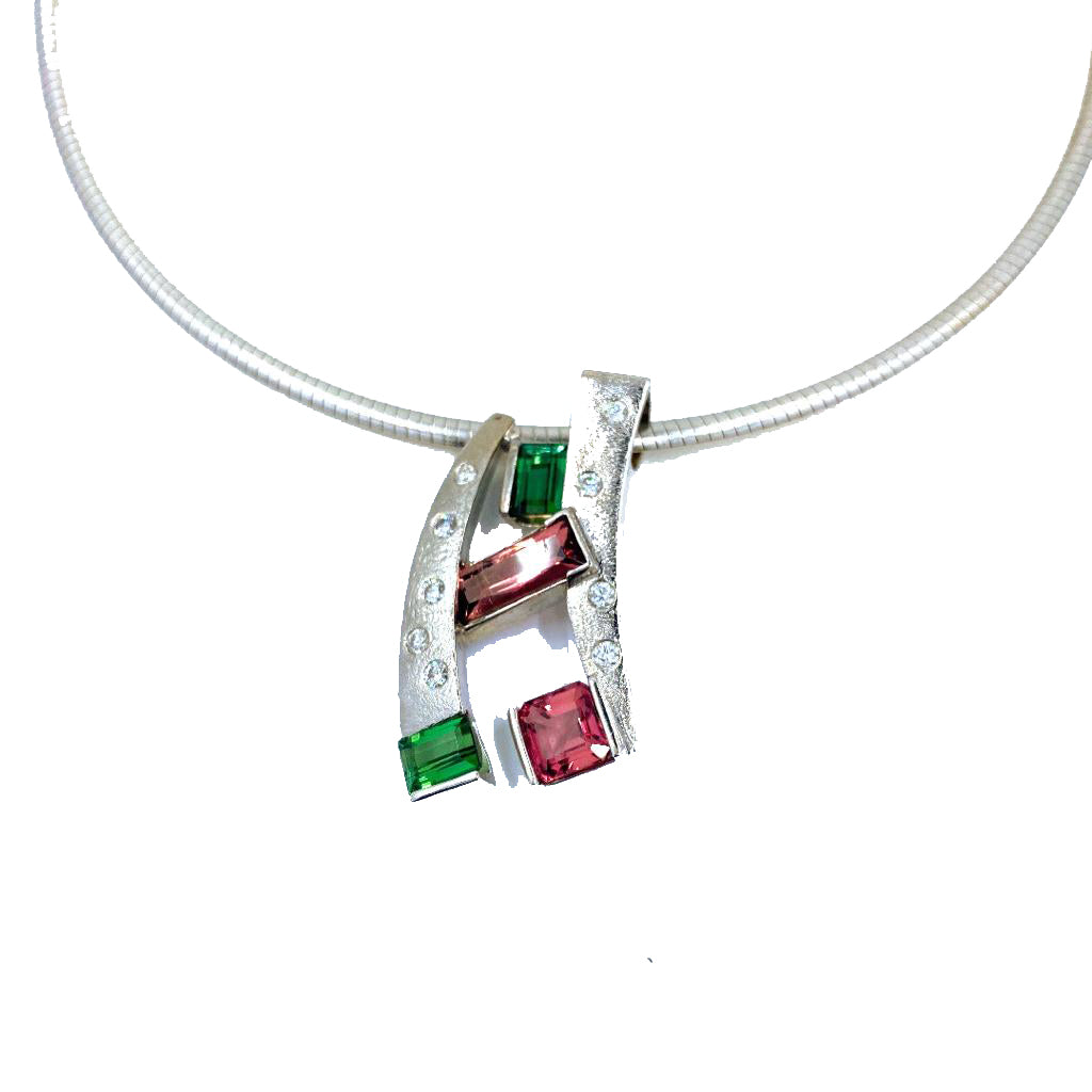 Hugo’s Signature 14k White Gold Original Multicolored Tourmaline and White Diamonds pendant / Necklace set.