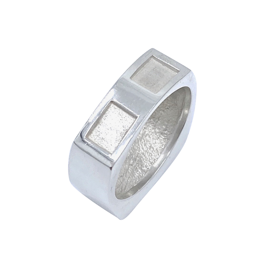 Hugo’s Signature Brushed Finish Sterling Silver .925 or 14k White gold squared ring. Unisex. Any size.